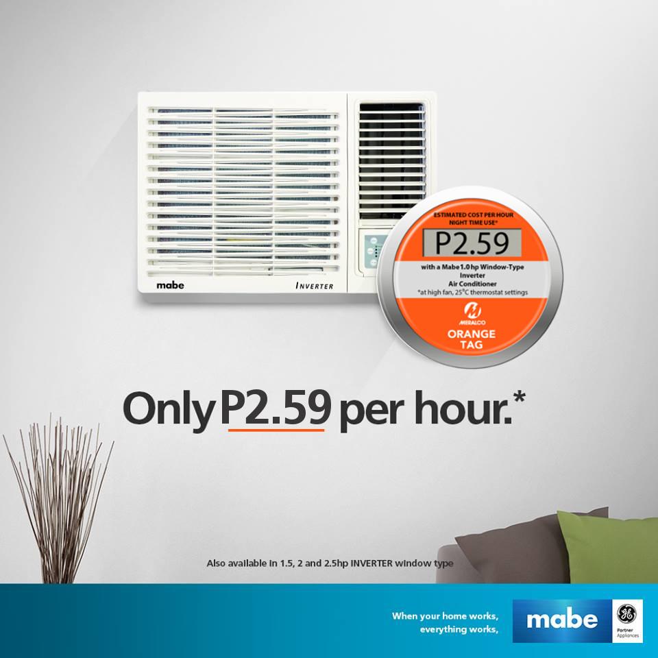 Only P2.59/hr* to keep your room cool this summer with mabe's 1hp Inverter Window Type Aircon! One of the lowest consumption rates among inverter aircons today. Also available in 1.5, 2 and 2.5hp Inverter Window Type *Based on Meralco Power Lab Test under the following test conditions with the mabe INVERTER 1hp window type airconditioner: Average of 8 hours night time use, 25'c thermostat at high fan speed. |
