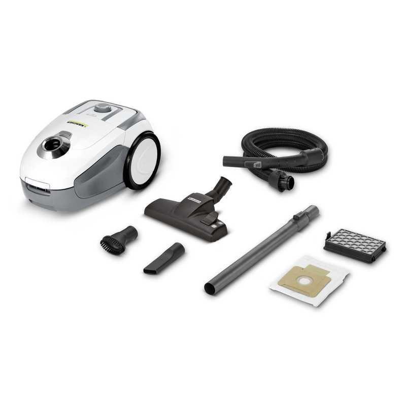 The white VC 2 vacuum cleaner with dust bag is easy to operate and store and is ideal for removing large quantities of dirt.